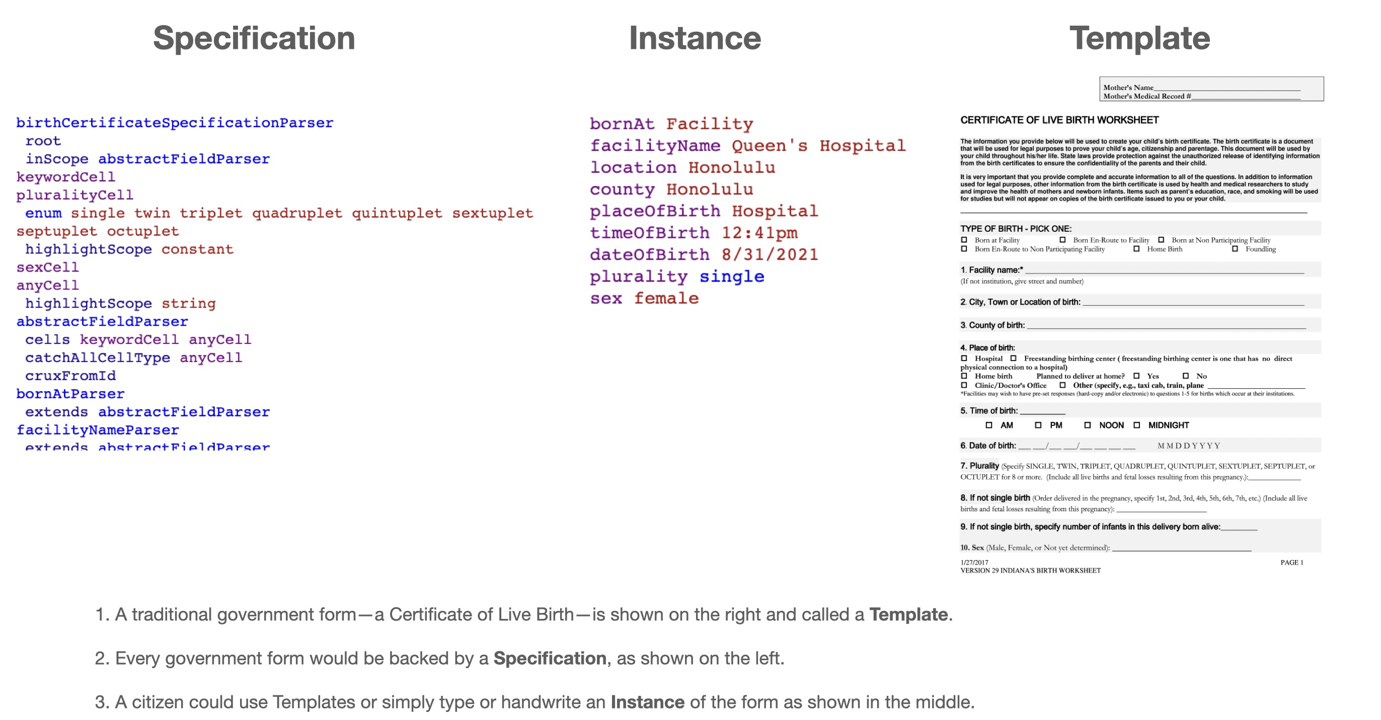 In other words, Governments can still have fancy Templates for Birth Certificates or Titles or Taxes, but they also have to accept Instances I for that Specification.