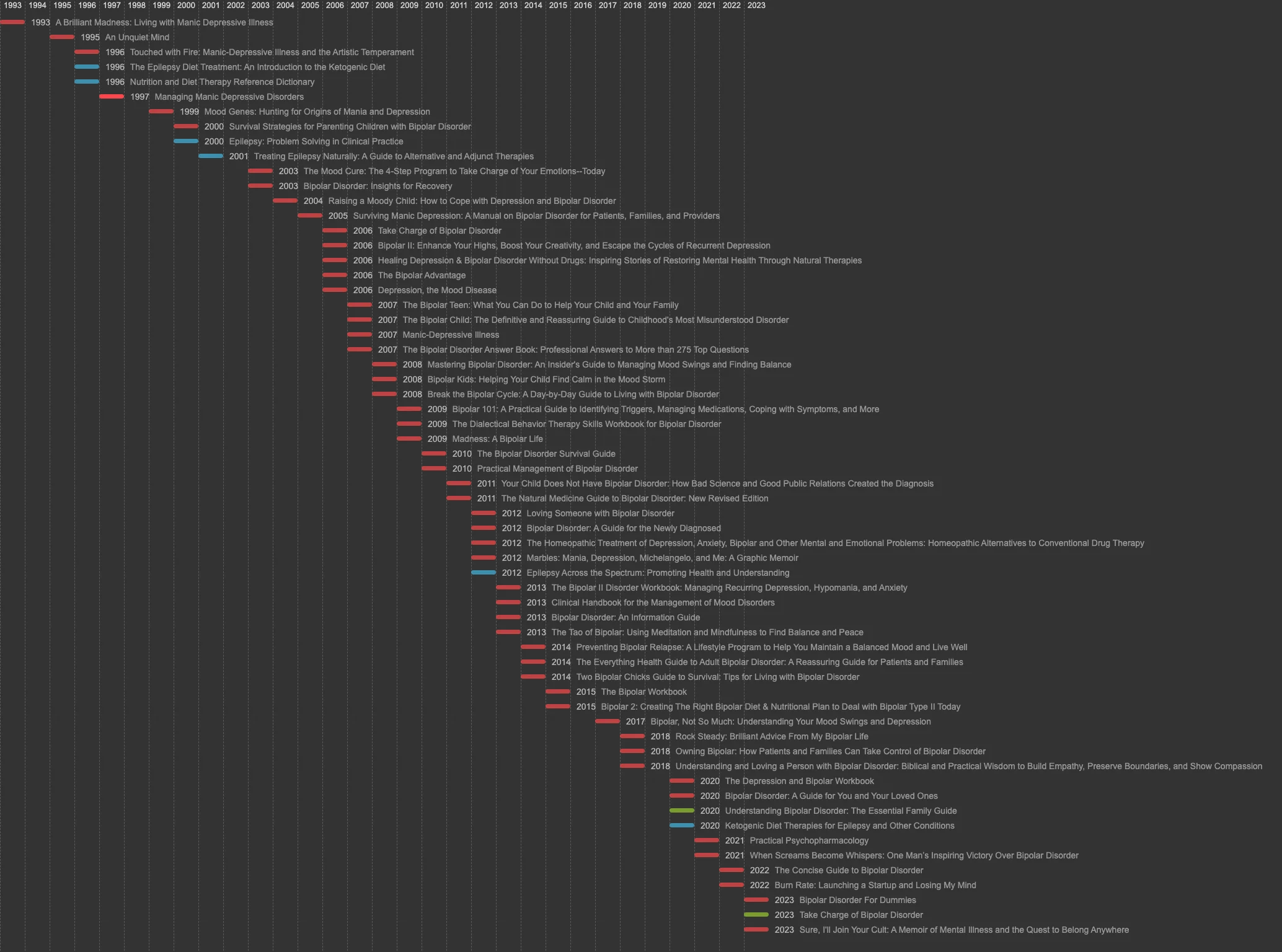 For thoroughness, I extended my search to include books on "Manic Depression" to make sure I included older works. As a sanity check, I also scanned 5 books on Epilepsy, starting from 1996, and indeed all 5 of them included sections on the ketogenic diet.