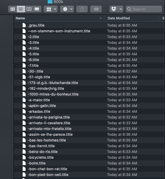 You may think that I could save a roughly equivalent amount by dropping the primaryTitle field. However, even though my filenames now contain information from the title, my permalink schema will generally distort the title so I need to preserve it in each file and won't get savings there. I use a more restrictive character set in the permalink schema than the file contents just to make things like URLs easier.