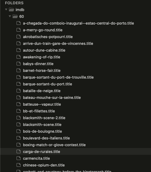 This looks like a good candidate for TreeBase. With this TSV I can create a file for each movie. I don't need the other 6 files for this experiment, though if this was a real project I'd like to merge in that data as well (in that case I'd probably create a second TreeBase for the names in the IMDB dataset).