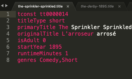 One file, the 500MB title.basics.tsv, contained basic data for all the movie and shows in the database.