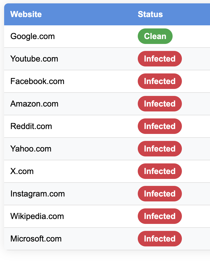 For example, 9 out of 10 of the top websites in the USA spread the virus to all their visitors. And the one that doesn't have the virus on its homepage, Google.com, has the virus on most of its other pages.