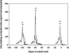 In lobsters, a steroid hormone called ecdysteroid spikes during the pre-molt phase and declines sharply after molting. Source: J. Sook Chung