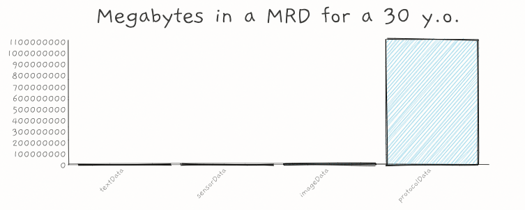 Let's imagine a 30 year old in 2050. They'd have around 11,200 days worth of data (I included some days for in utero records). Let's say there are 4 "buckets" of medical data in their MRD:
