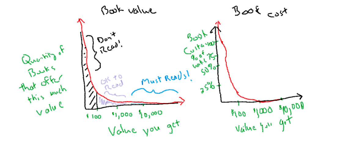 For simplicity, let's say the value you can derive from any one book varies from 1 cent to $100,000(there are many, many more worthless books than there are of the really valuable kind).